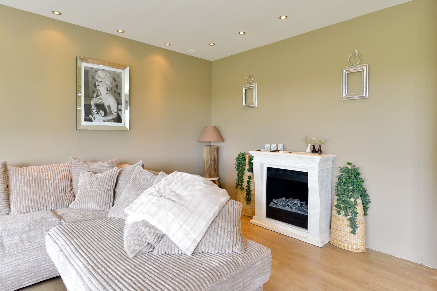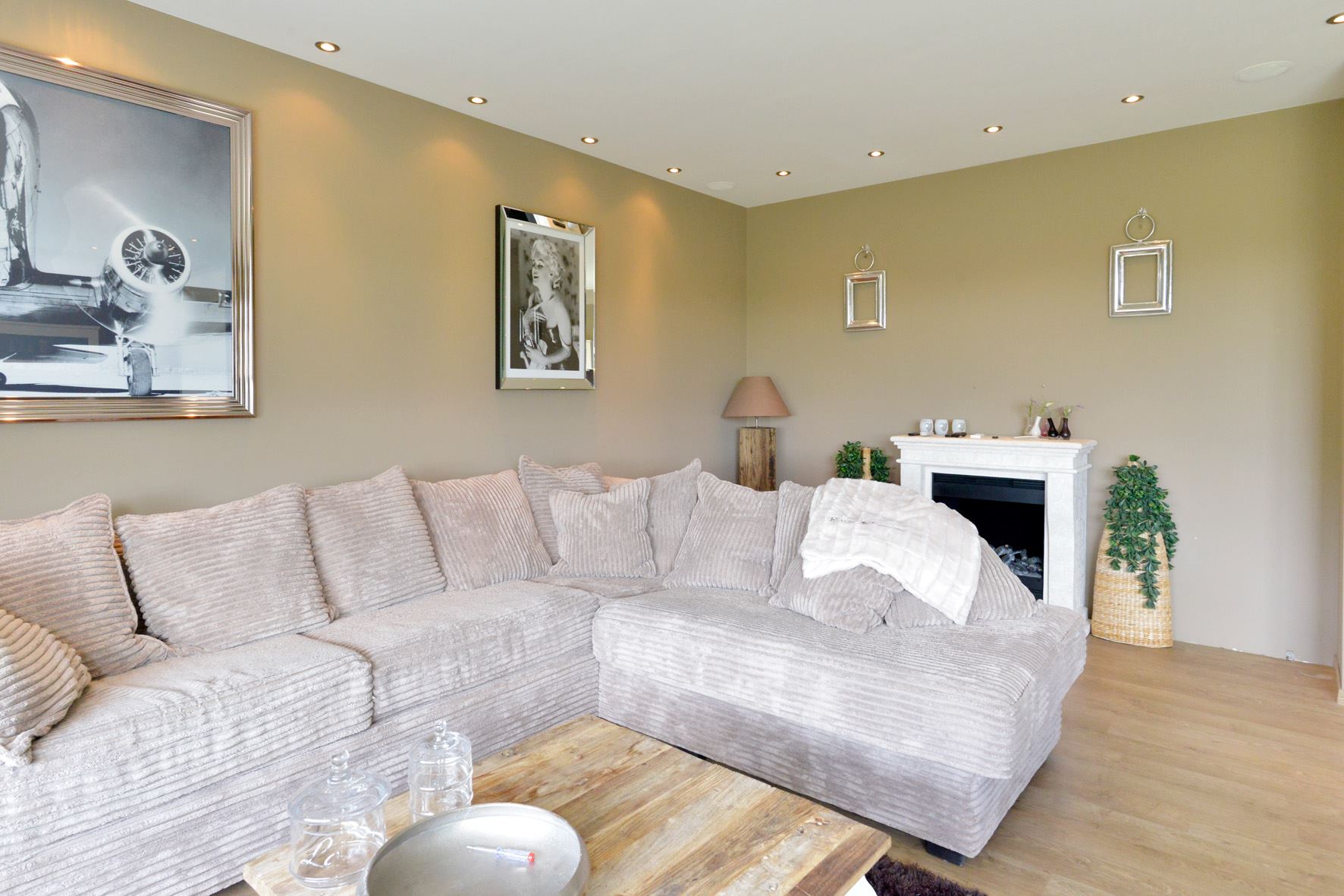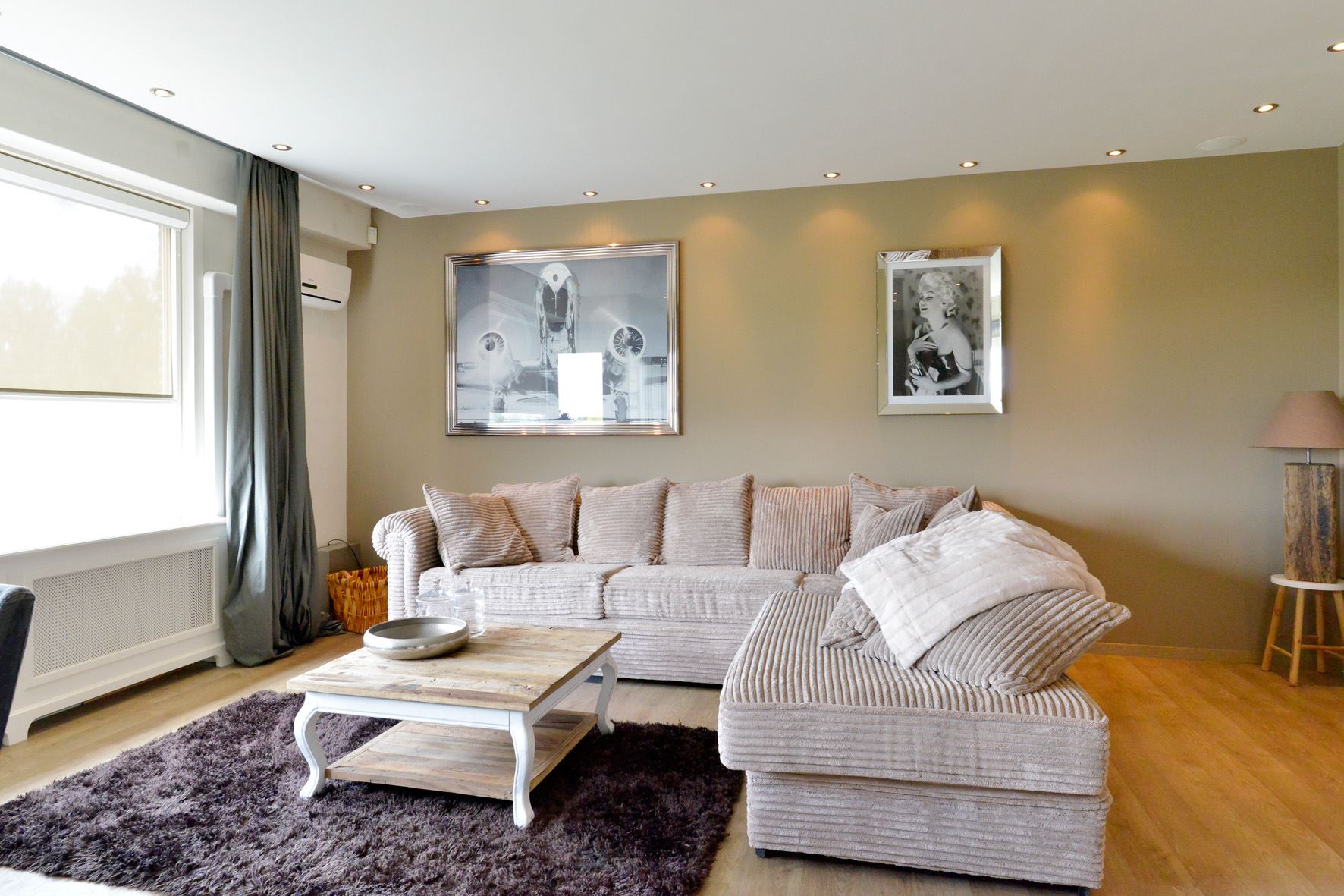 * Sfeervolle woonkamer 6.58 x 6.05 met een mooie laminaatvloer, gestukadoorde wanden en plafond (met