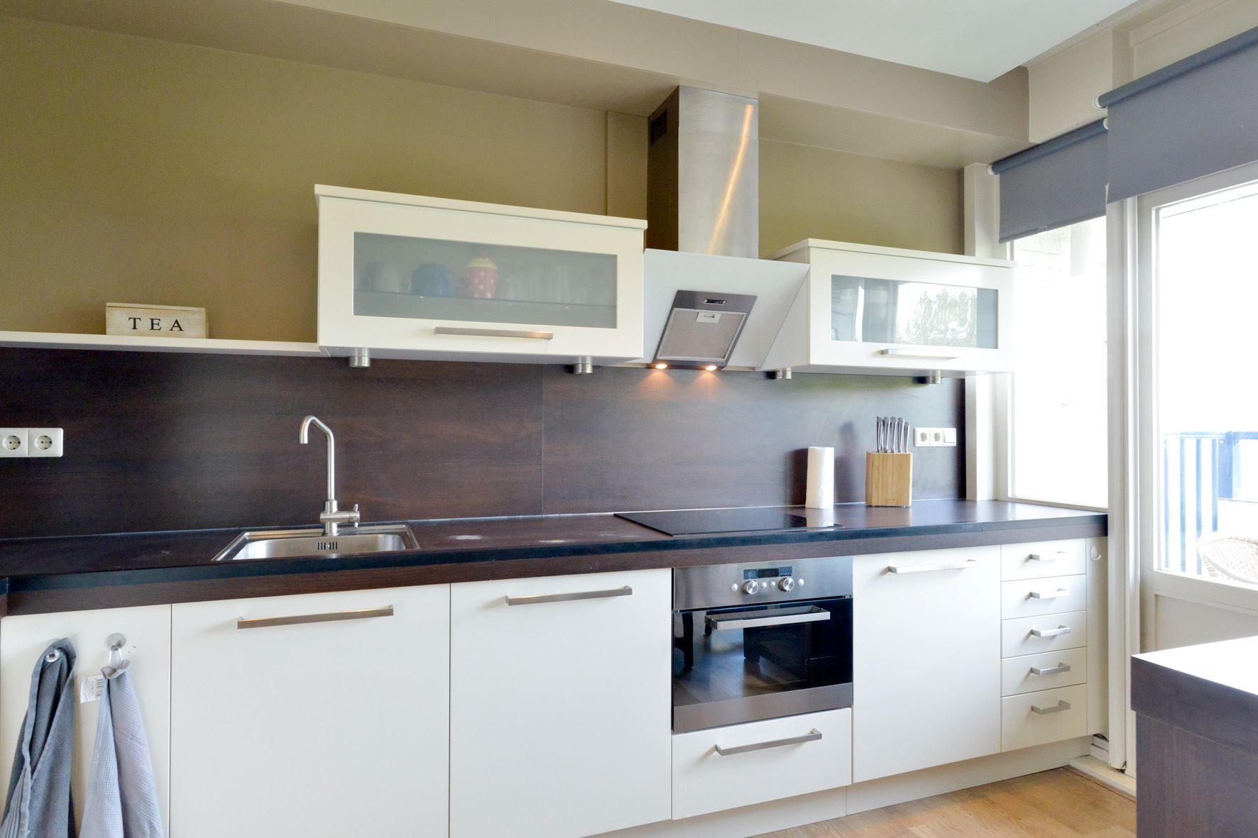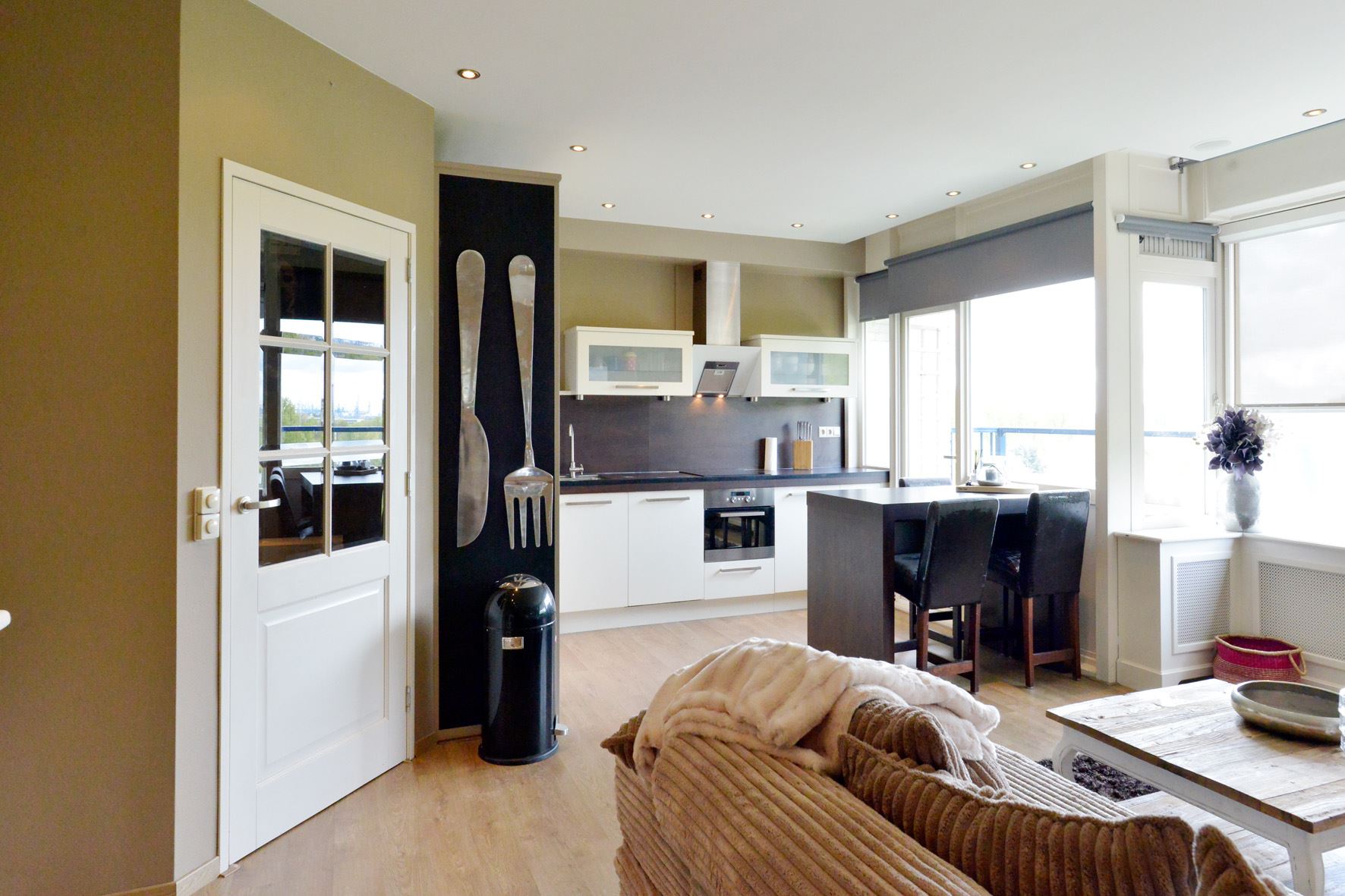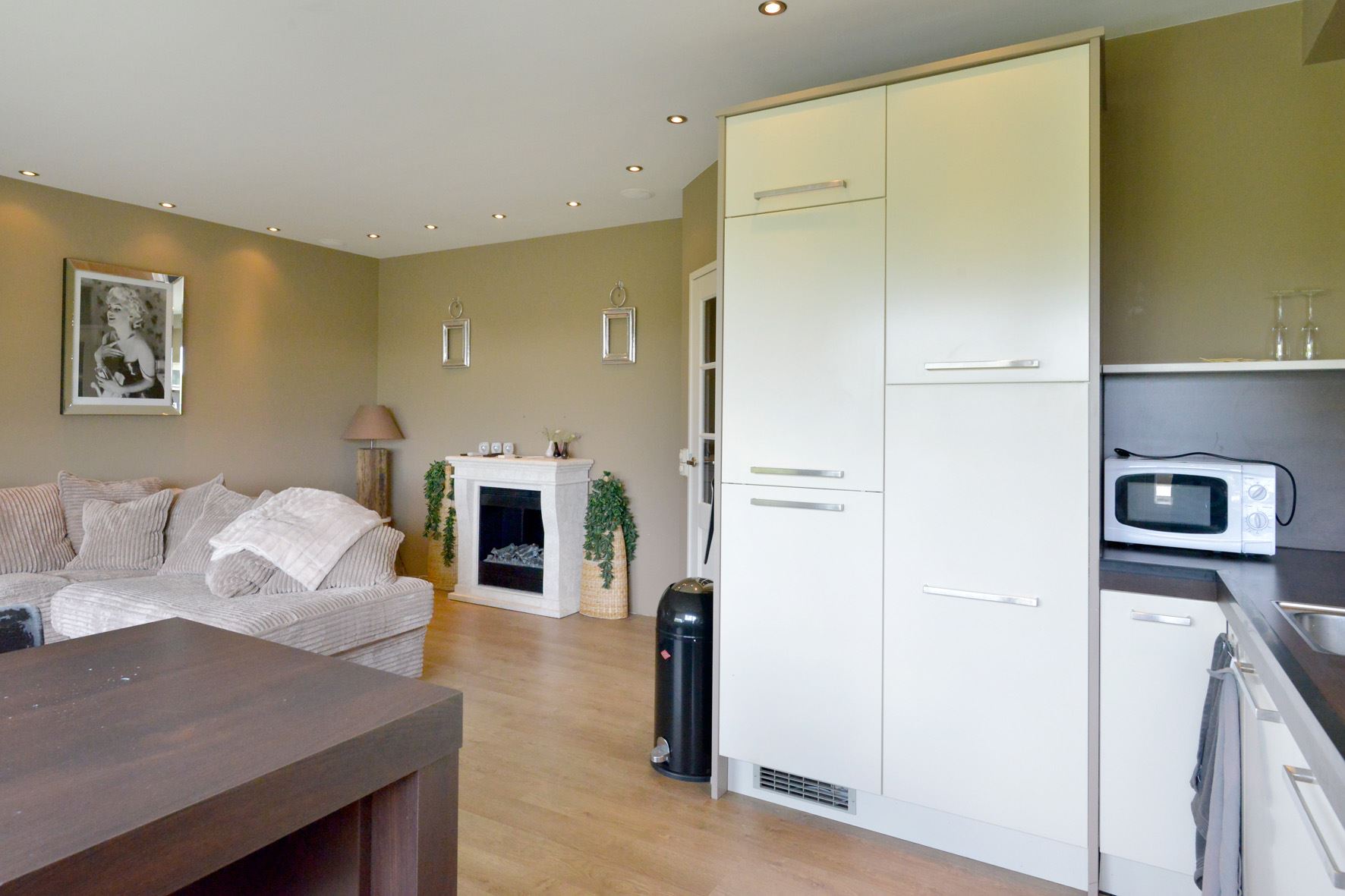 inbouwapparatuur: inductiekookplaat, oven, magnetron, koelkast, vaatwasmachine, afzuigschouw; verder is hier de