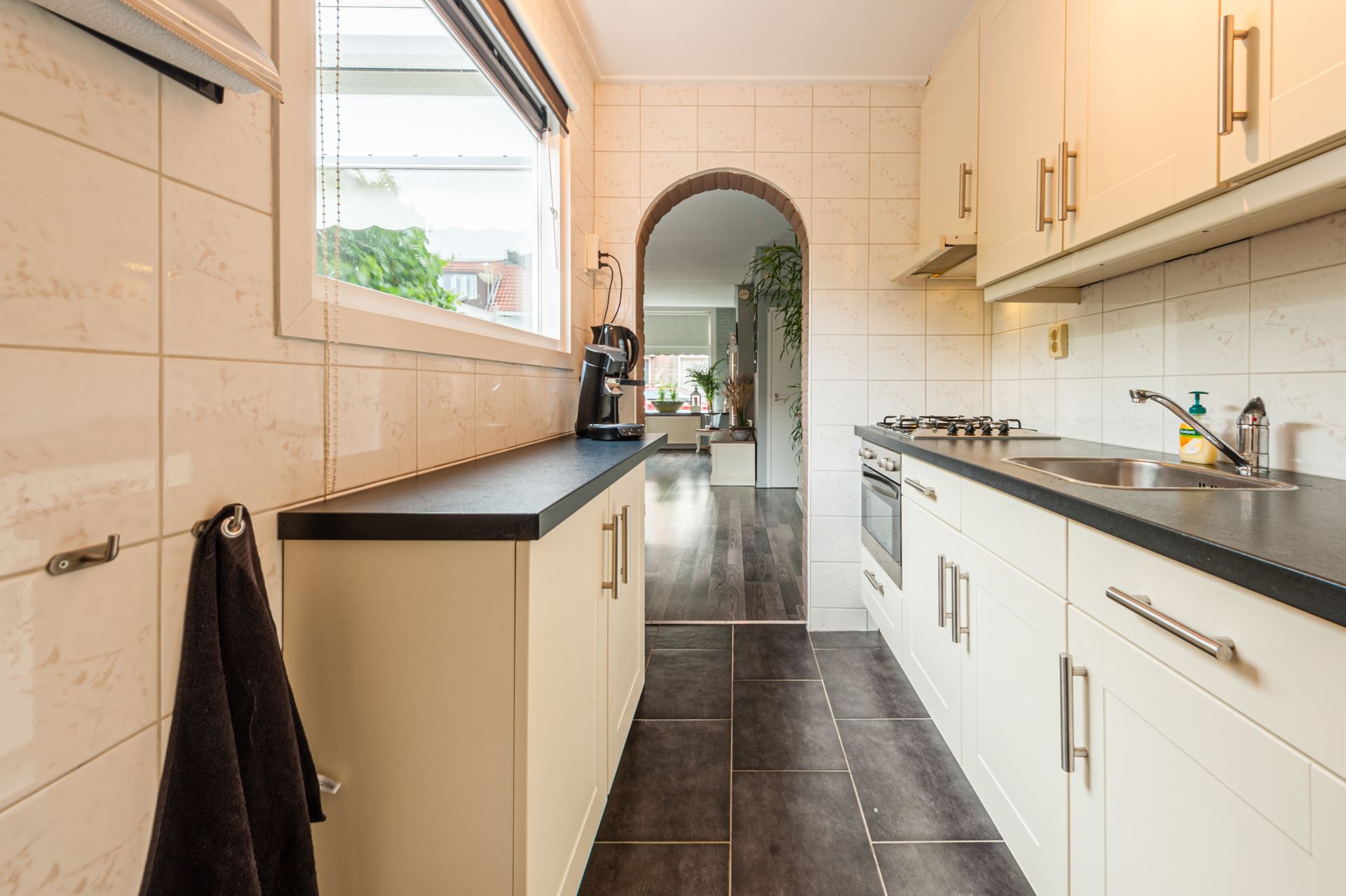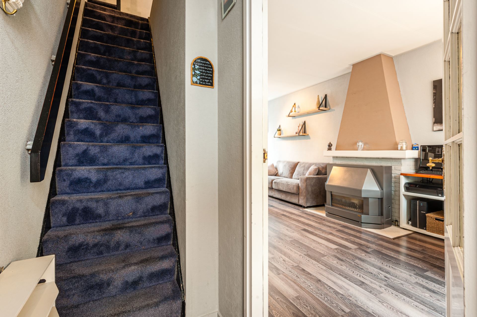 Entree, hal, trap naar eerste verdieping, trapkast met meterkast, toilet en toegang tot de keuken en woonkamer. Woonkamer met openhaard, opbergruimte en open toegang tot de keuken. Een royale achtertuin (met achterom) welke is gelegen op het westen. Volledig betegelde keuken met keukenblok en inbouwapparatuur. Via de keuken is tevens de tuin te bereiken.